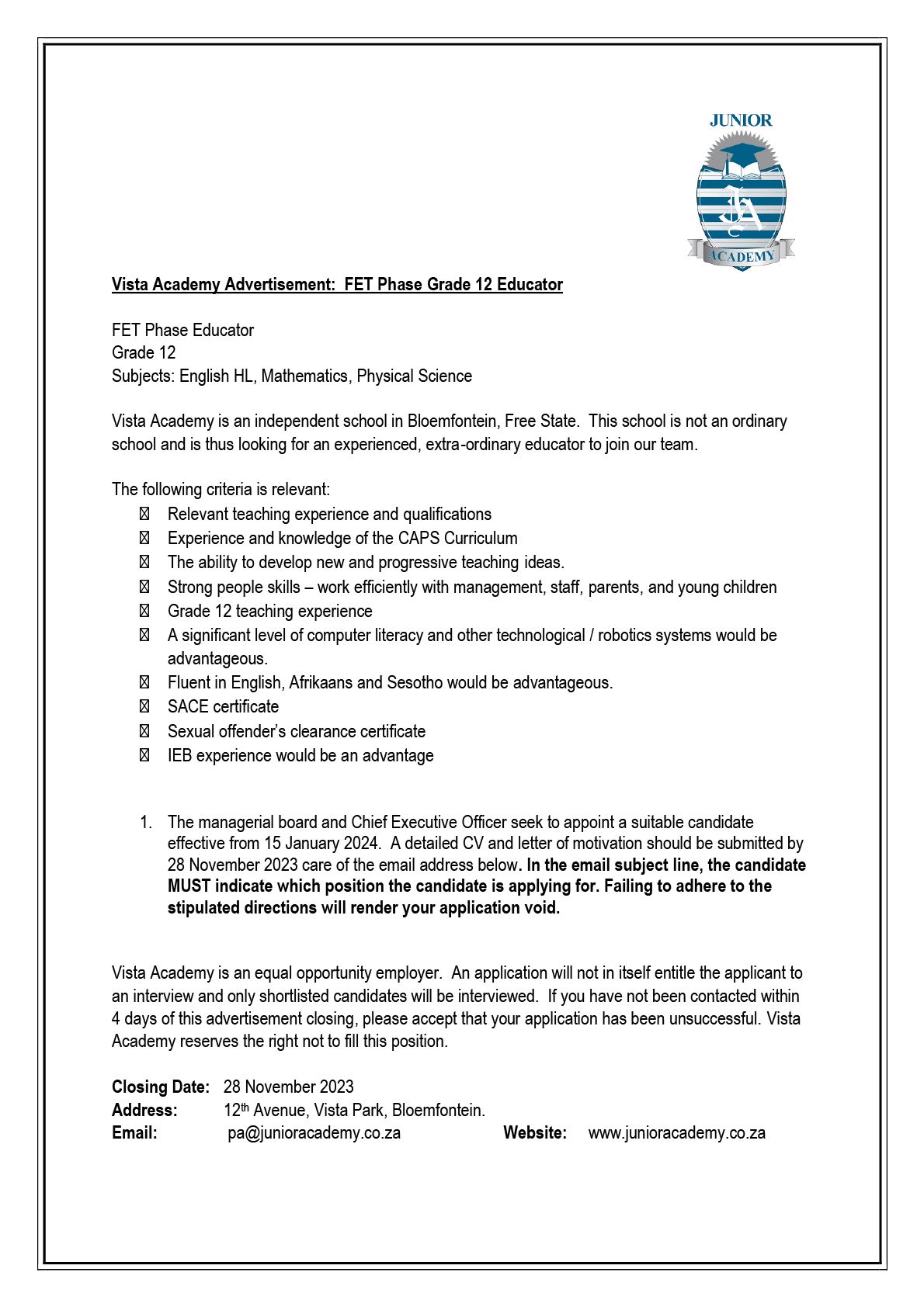 Vista Academy is an independent school in Bloemfontein, Free State. This school is not an ordinary school and is thus looking for an experienced, extra-ordinary educator to join our team.
