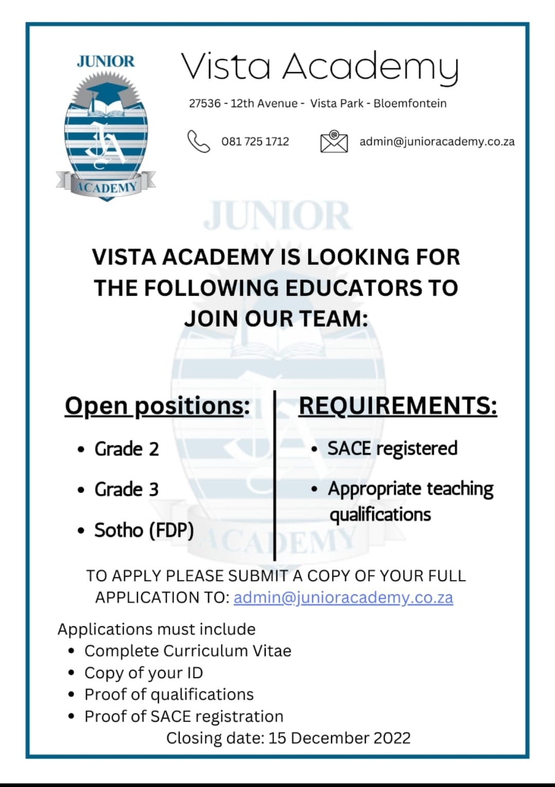 Interested candidates can forward their applications to admin@junioracademy.co.za