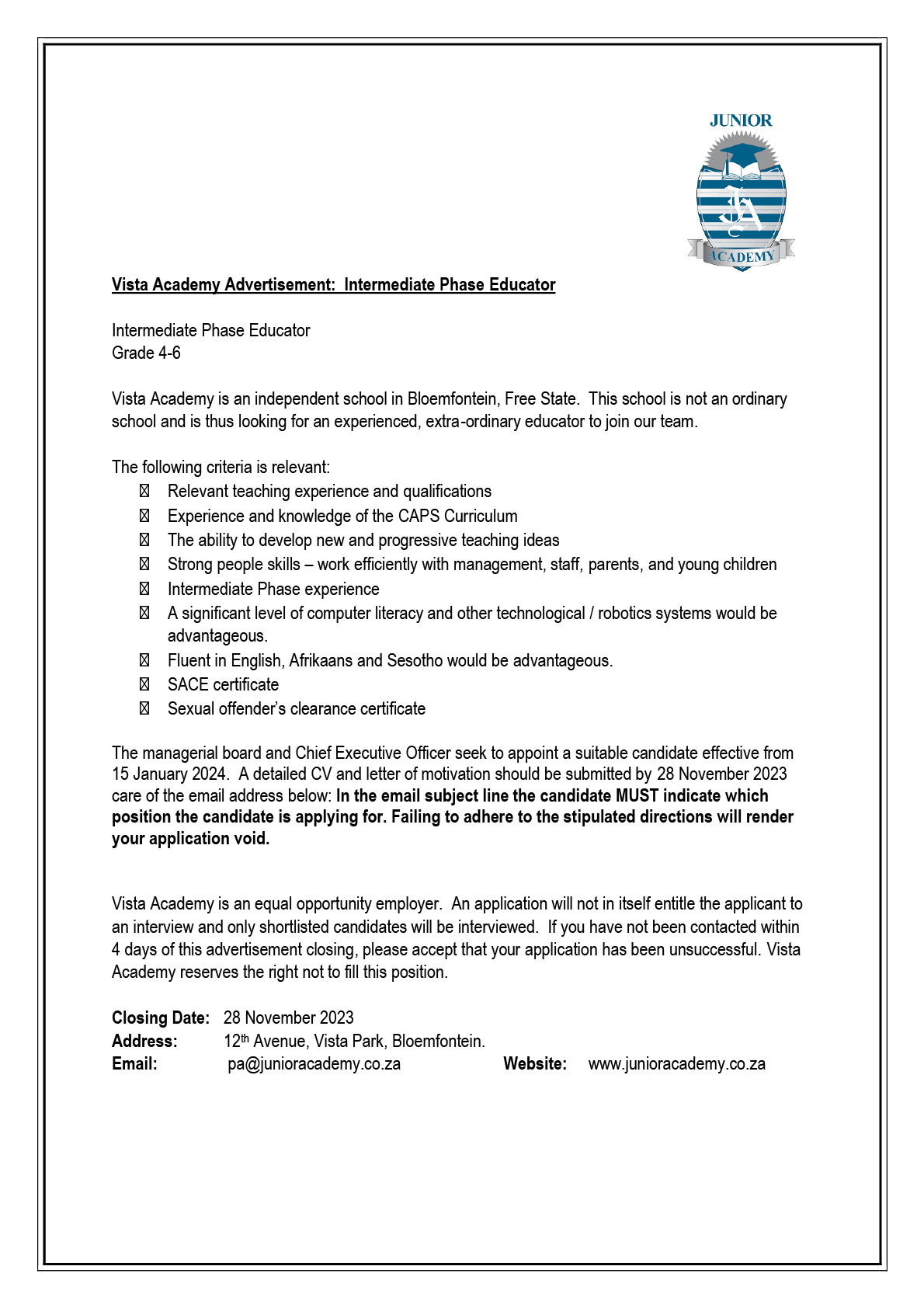 Interested candidates can forward their applications to pa@junioracademy.co.za